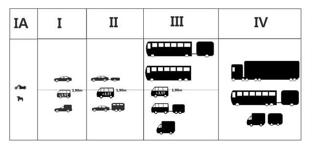Zgodnie z Częścią II, paragraf 2 «Kodeksu Przepisów Pobierania Opłaty za przejazd» (w Chorwacji), pojazdy są podzielone na 5 kategorii — IA, I, II, III, IV.