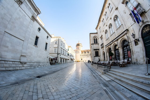 Doskonałym punktem orientacyjnym będzie ulica Placa, którą często nazywają Stradun — to główna ulica historycznego centrum miasta, wybrukowana wapieniem i otoczona dużymi starymi domami. Warto zauważyć, że wszystkie budynki są tutaj zbudowane według jednego planu architektonicznego.