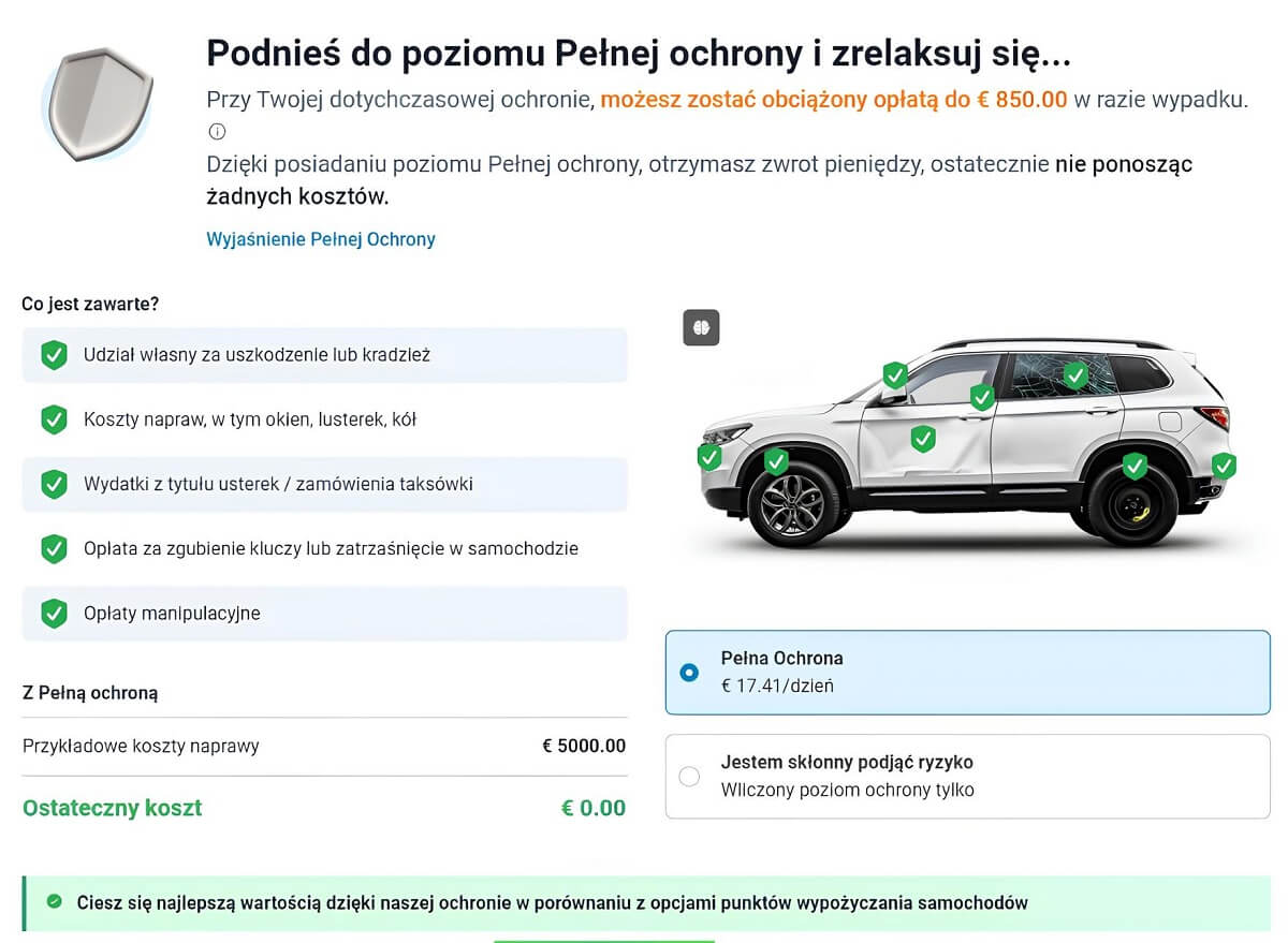 Podczas rezerwacji auta online przez Discover Cars możesz skorzystać z opcji «pełnej ochrony» oferowanej przez tego pośrednika. To jak pełne ubezpieczenie w firmach wynajmujących auta, tyle że tańsze. Tak, koszt wynajmu auta będzie nieco wyższy o kilka euro, ale w zamian otrzymasz tę samą pewność, jak przy wykupieniu pełnego ubezpieczenia u wynajmującego.