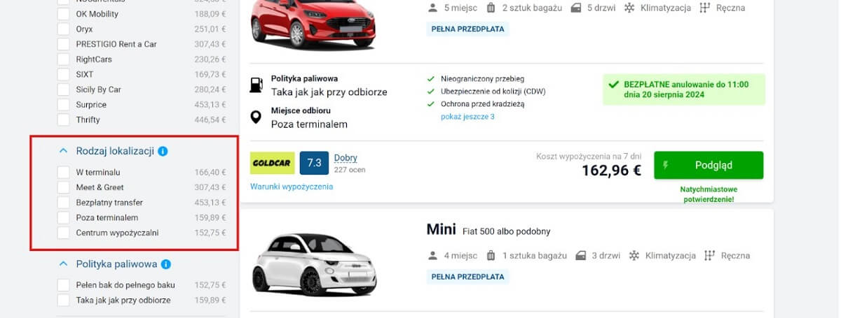 Na stronie Discovercars można filtrować oferty według lokalizacji wypożyczalni