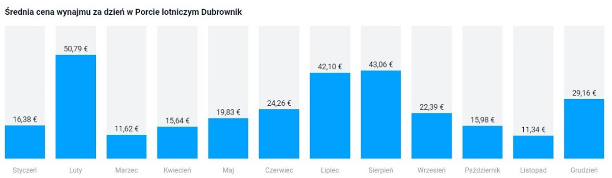 Z wykresu wynika, że według strony Discover cars najkorzystniejszym miesiącem na wynajem samochodu na lotnisku w Dubrowniku jest listopad, kiedy średni koszt wynosi zaledwie 11,34 Euro za dzień. To o 55% mniej w porównaniu do średniorocznej ceny, a znacznie taniej niż w lutym, gdy wynajem kosztuje średnio 50,79 Euro dziennie (to dlatego, że Dubrownik w ostatnim czasie stał się bardzo popularnym miejscem dla tych, którzy chcą obchodzić Walentynki).