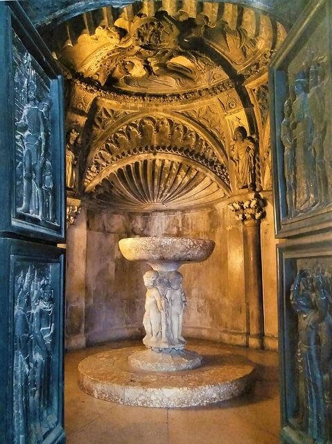 Oglądając katedrę, zajrzałem do małego okrągłego pomieszczenia — baptysterium. Jest ono ozdobione obrazami ze Starego Testamentu. Tutaj znajduje się również chrzcielnica