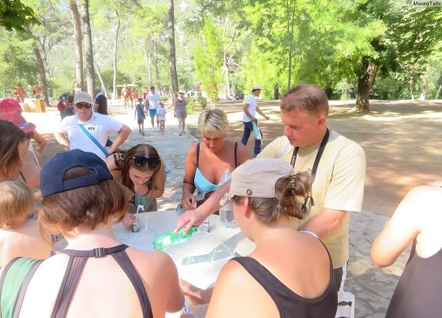 Jest dużo ludzi i wszystkim jest gorąco. Niektórzy się kąpią, inni odpoczywają w cieniu pod parasolami i za budynkiem. Przy fontannie zawsze ktoś nabiera wodę do butelek lub po prostu pije