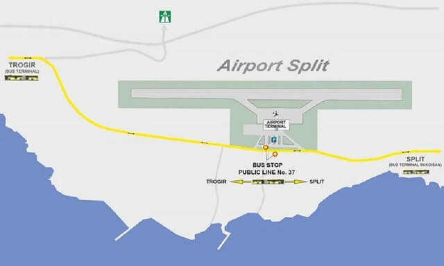 Tuż przy hali przylotów znajduje się przystanek autobusu publicznego. Stamtąd możesz wziąć autobus nr 37 z lotniska w Splicie do terminalu autobusowego w Splicie lub do terminalu autobusowego w Trogirze.
