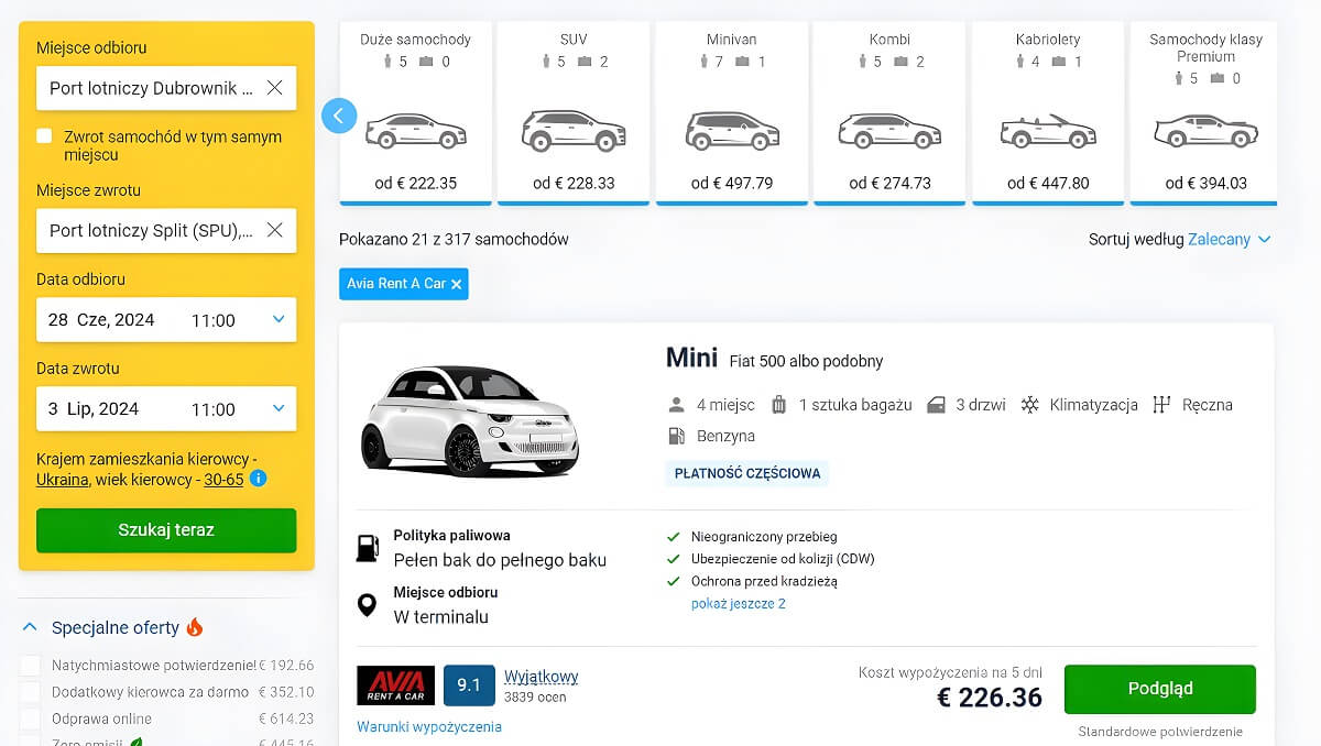 Porównanie kosztów wynajmu tego samego samochodu w przypadku odbioru i zwrotu w porcie lotniczym w Dubrowniku oraz przy zwrocie w porcie lotniczym w Splicie