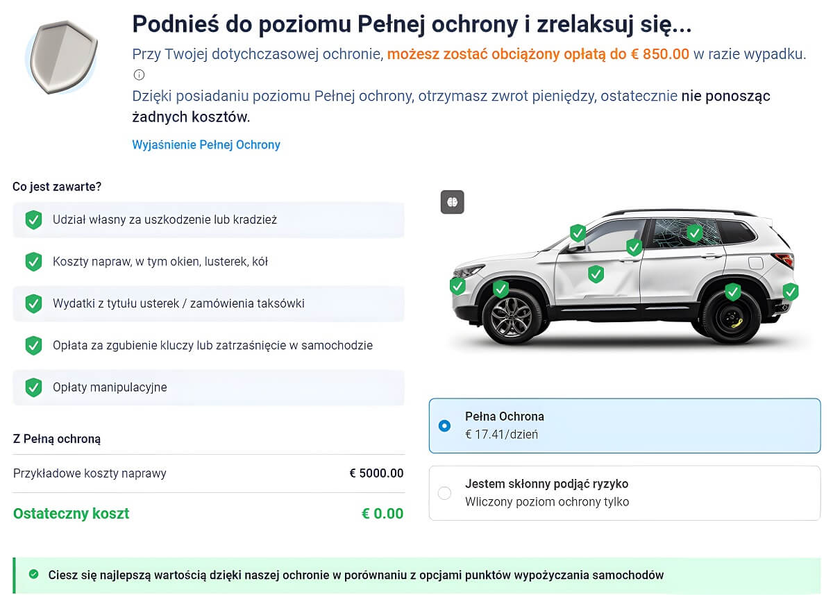 Koszt pełnego ubezpieczenia zależy od klasy samochodu, kraju wynajmu itd. Oznacza to, że nie ma stałej ceny za pełne ubezpieczenie. Mogę tylko podać rząd wielkości: od 12 euro dziennie za najtańszy samochód i wyżej.
